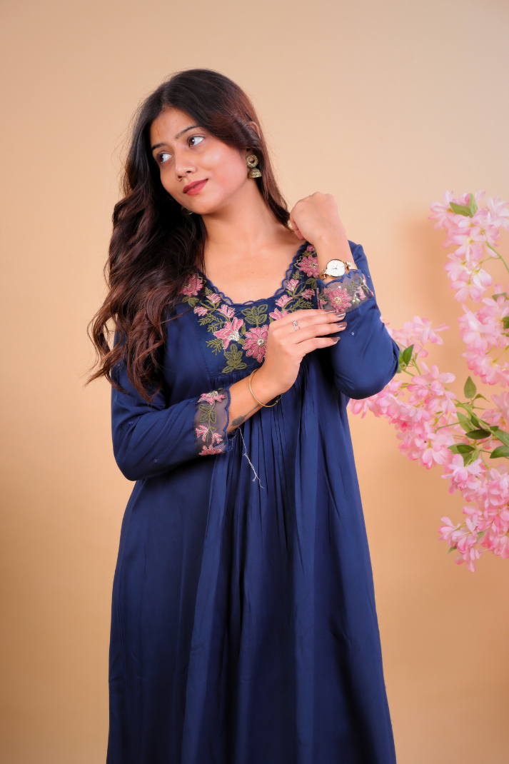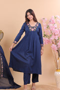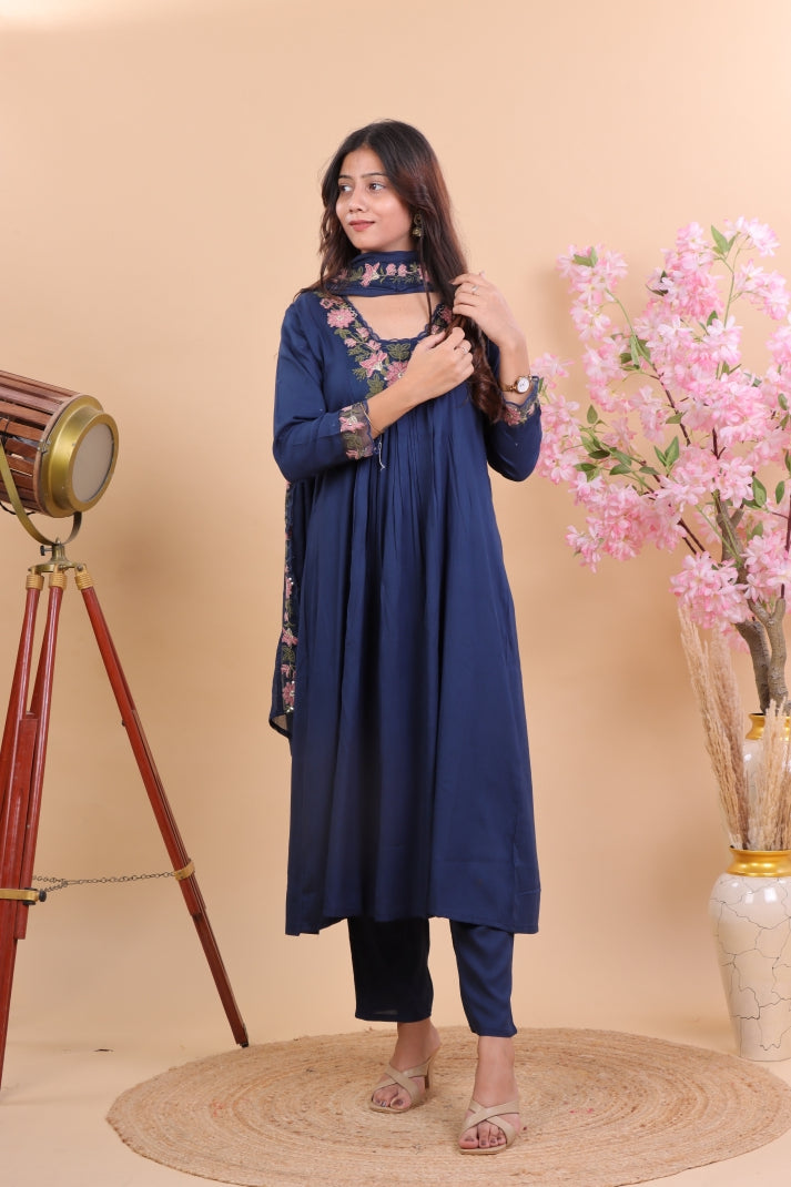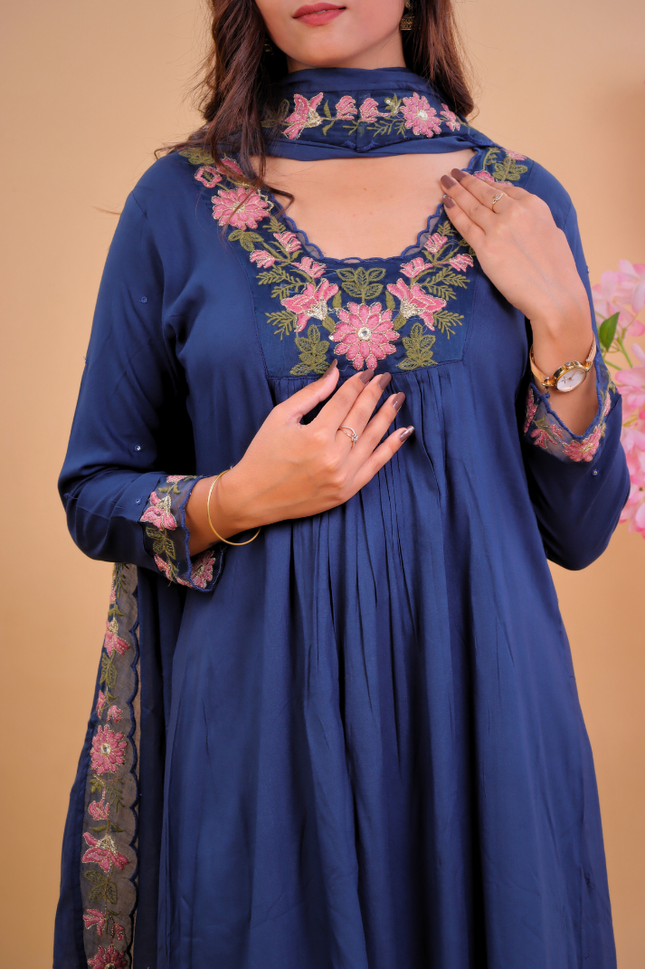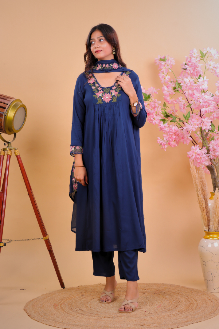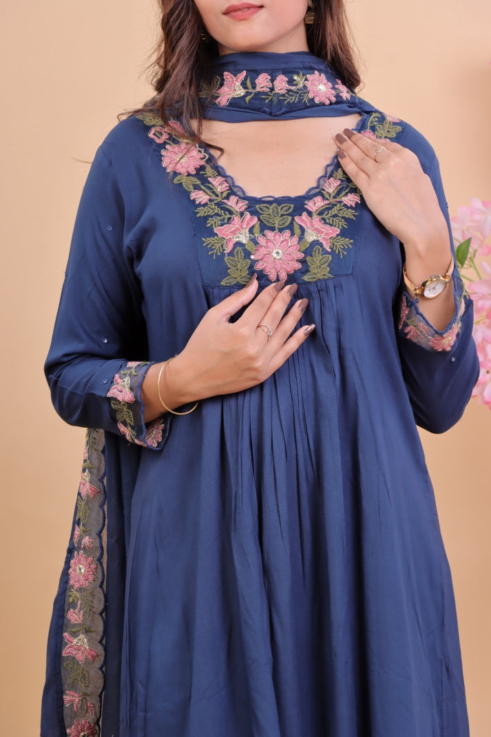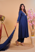 Navy Blue Floral Embroidered Kurta Set with Dupatta
