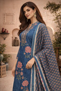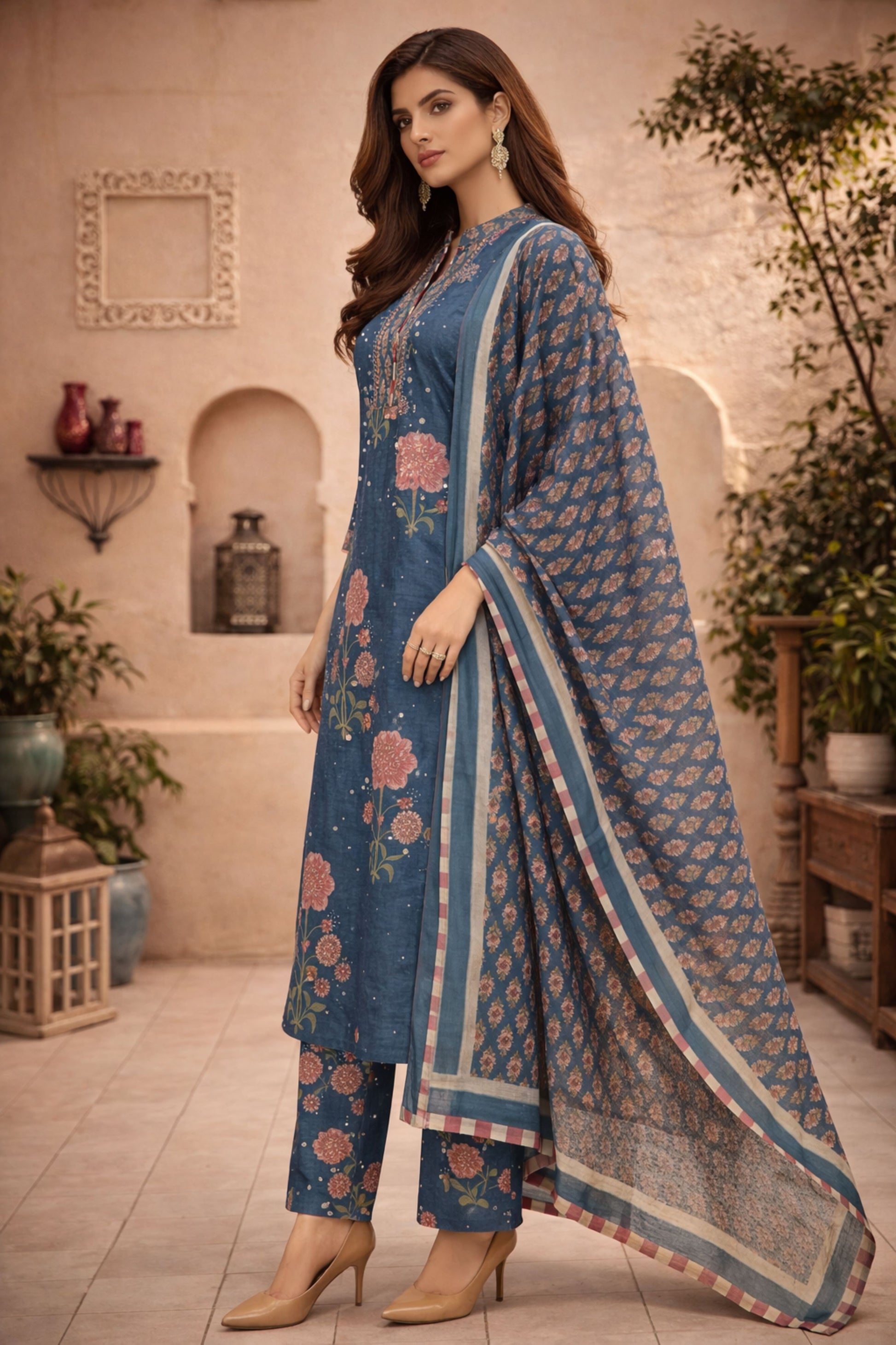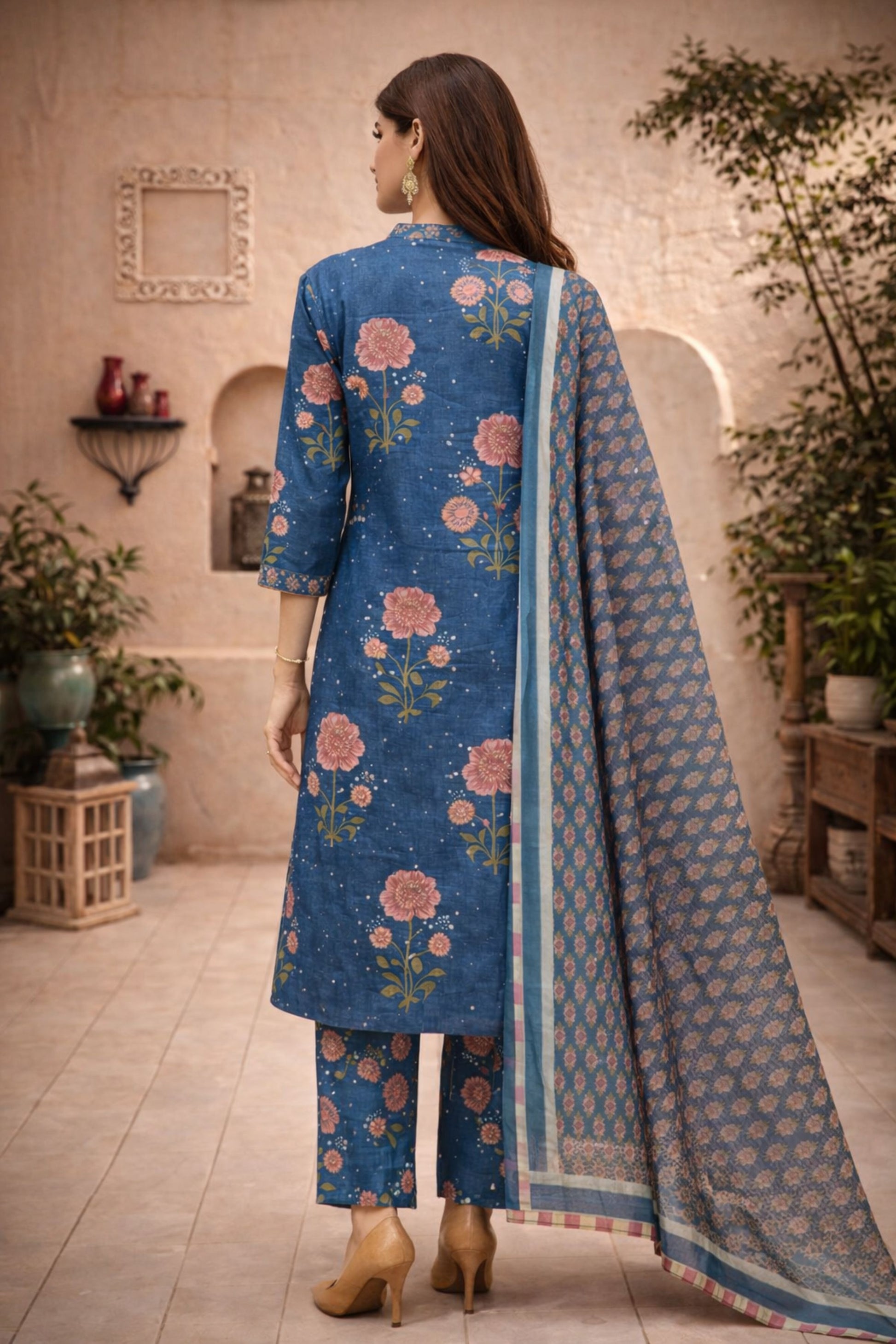 This navy blue printed 3-piece suit set features a beautifully tailored kurta paired with matching pants and a coordinated dupatta. The rich navy blue base enhanced with intricate traditional prints creates a graceful and elegant ethnic look, perfect for occasions and refined everyday wear. Crafted from soft and breathable cotton fabric, this set offers all-day comfort with a flattering, relaxed fit. Sophisticated, timeless, and effortlessly stylish, it is an ideal choice for classic ethnic dressing.