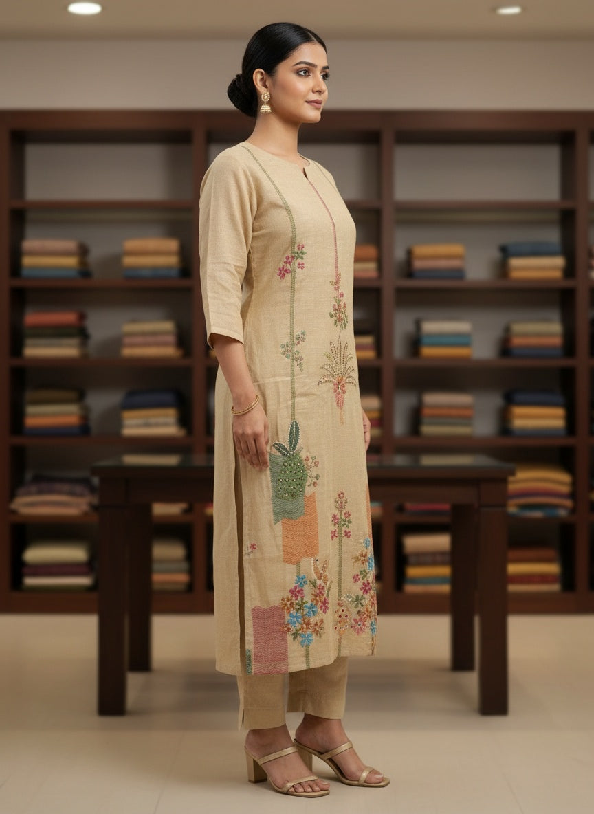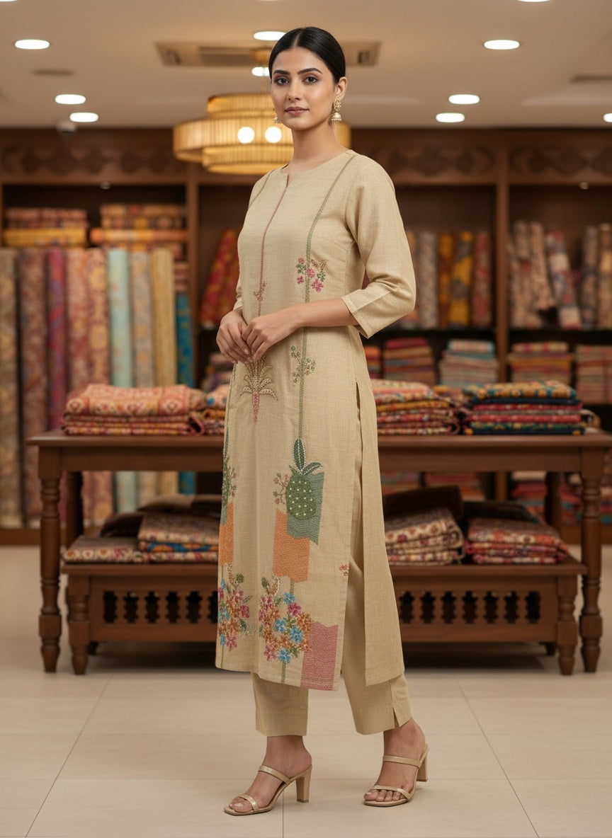 Neutral Beige Kurta & Pants with Dupatta – Artisanal Embroidery
