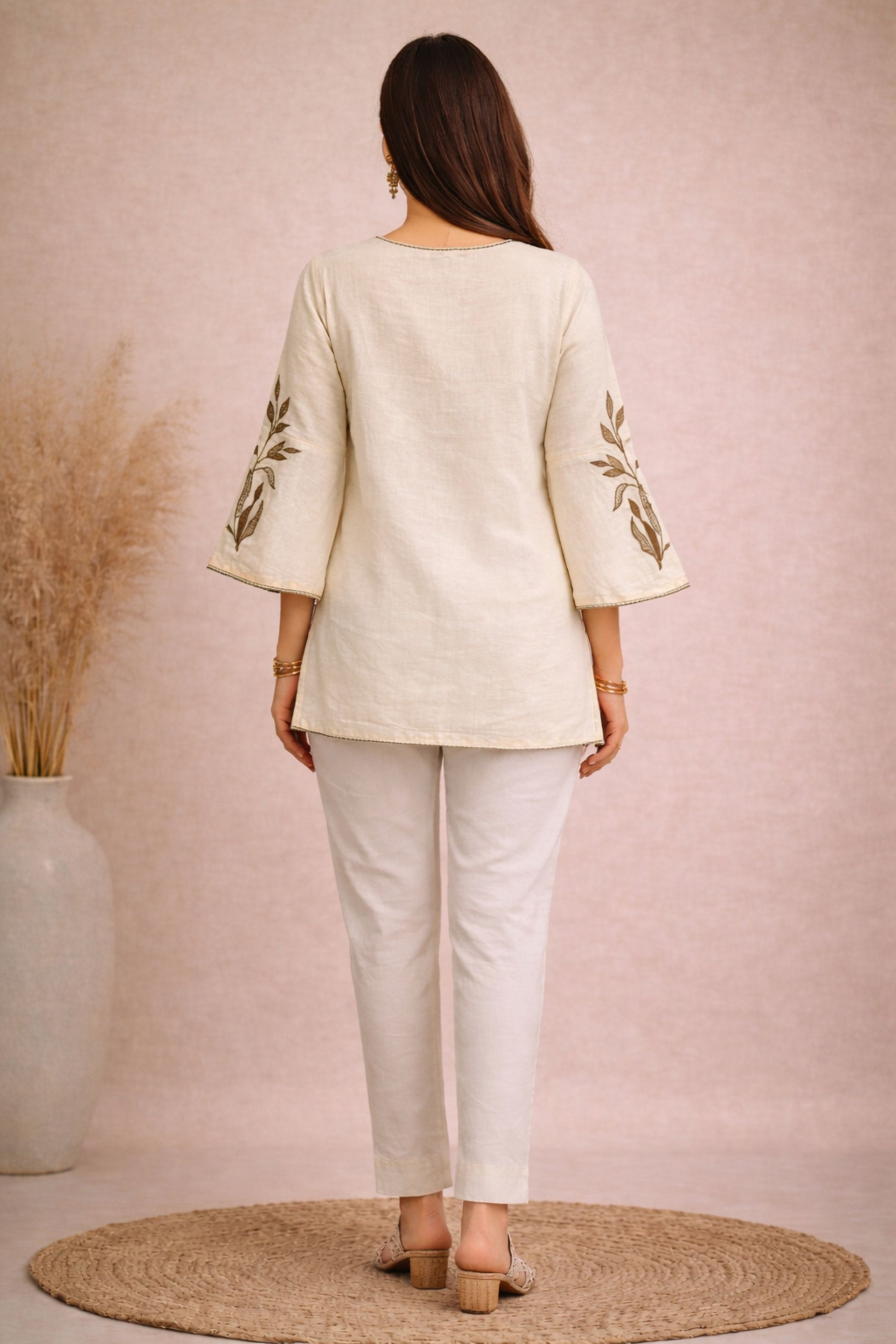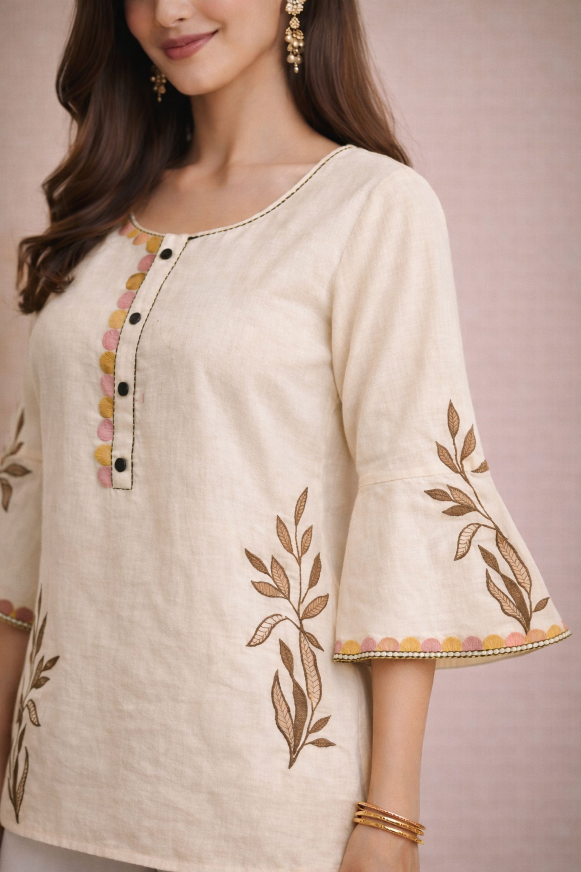 This off-white short kurti features a straight silhouette enhanced with delicate floral embroidery detailing on the front and sleeves. The soft off-white tone creates a fresh and elegant look, making it perfect for casual outings and everyday wear. Crafted from comfortable and breathable cotton flex fabric, it offers a relaxed fit with effortless style. Subtle, refined, and versatile, this kurti is an ideal choice for modern ethnic dressing.