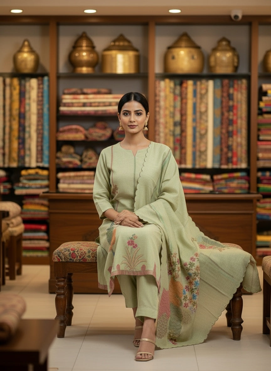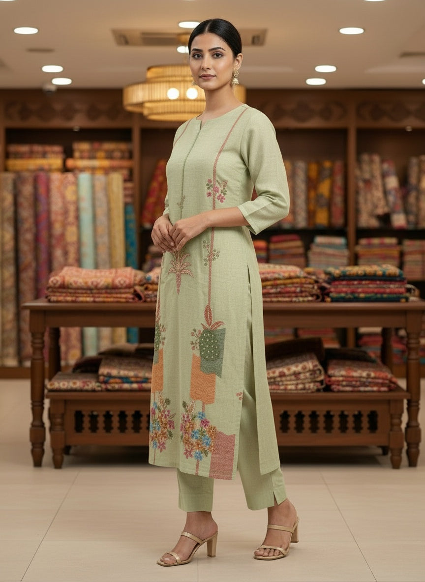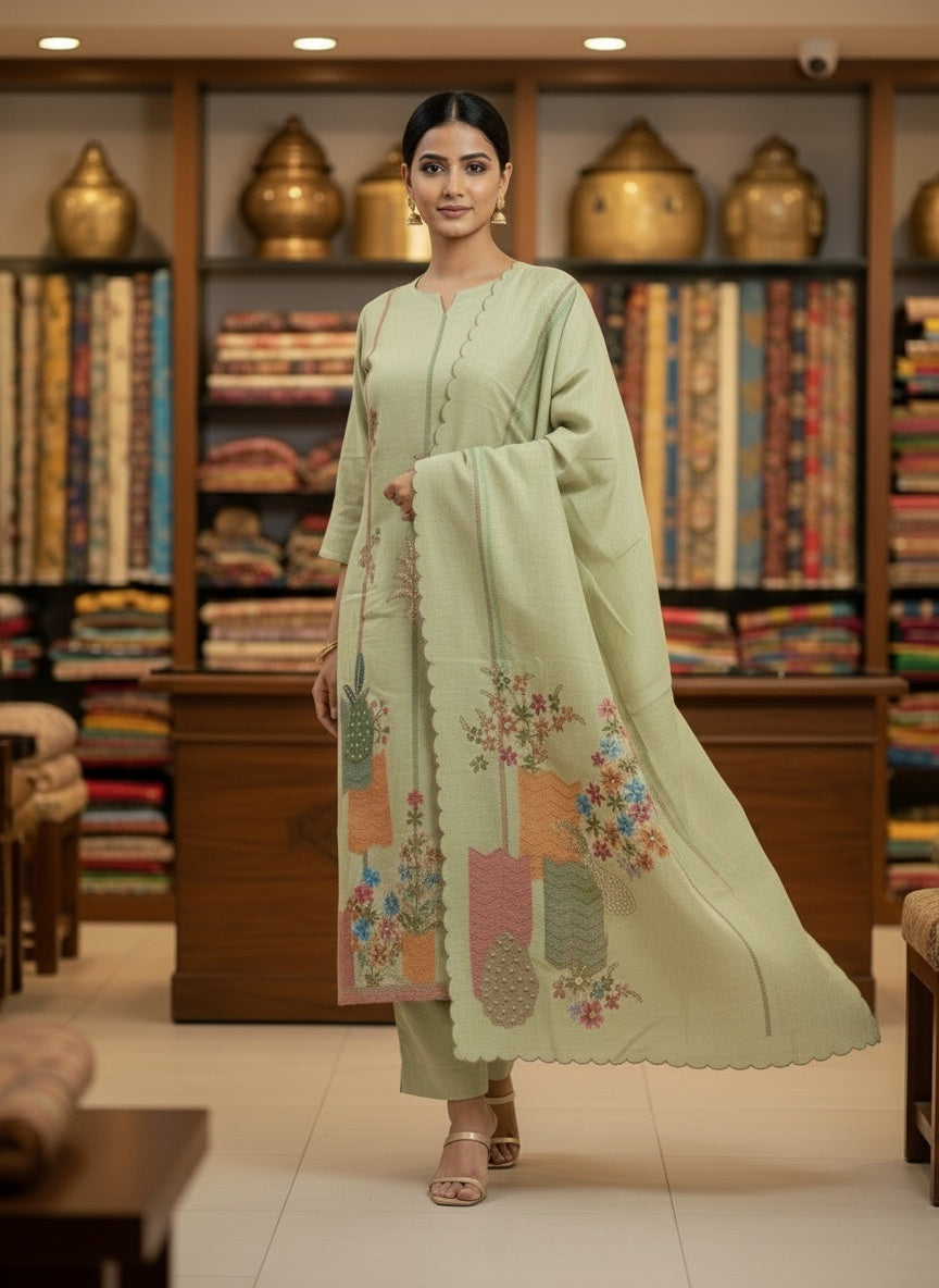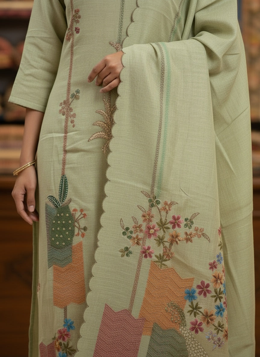 Pista Green Kurta & Pants with Dupatta – Artisanal Embroidery