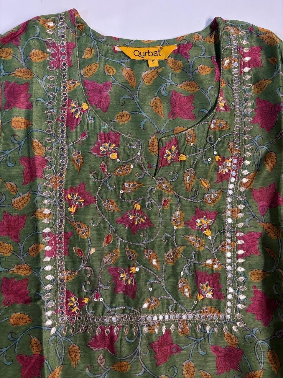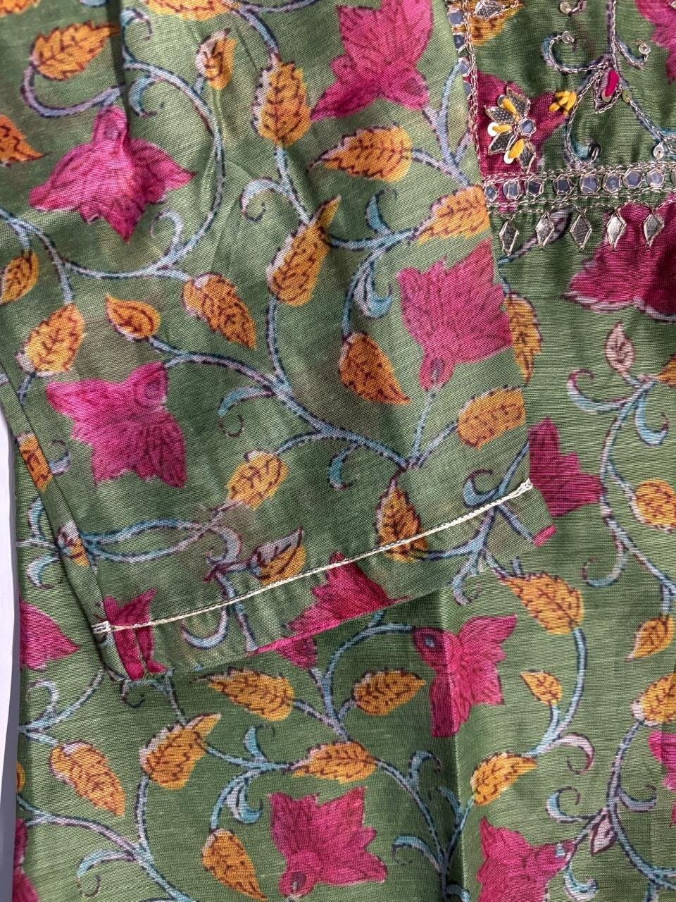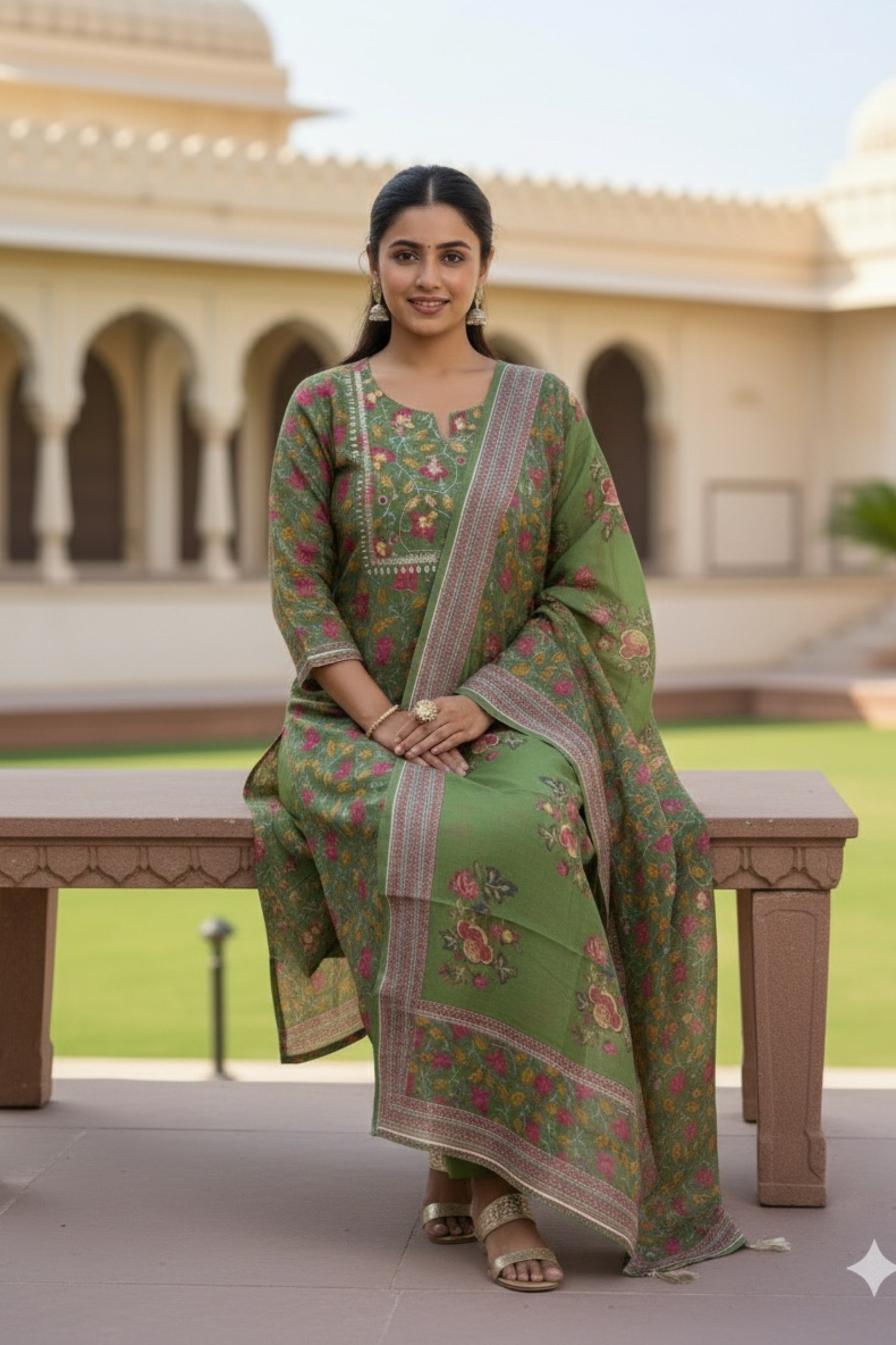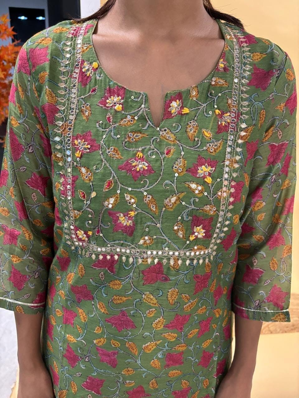 Elevate your festive and everyday ethnic look with this elegant Green Chanderi Suit Set, crafted from premium-quality Chanderi fabric. The kurta features intricate floral prints enhanced with delicate embroidery, paired with straight-fit pants for effortless comfort. A beautifully designed printed dupatta completes the ensemble, making it perfect for festive gatherings, traditional functions, or casual ethnic outings.