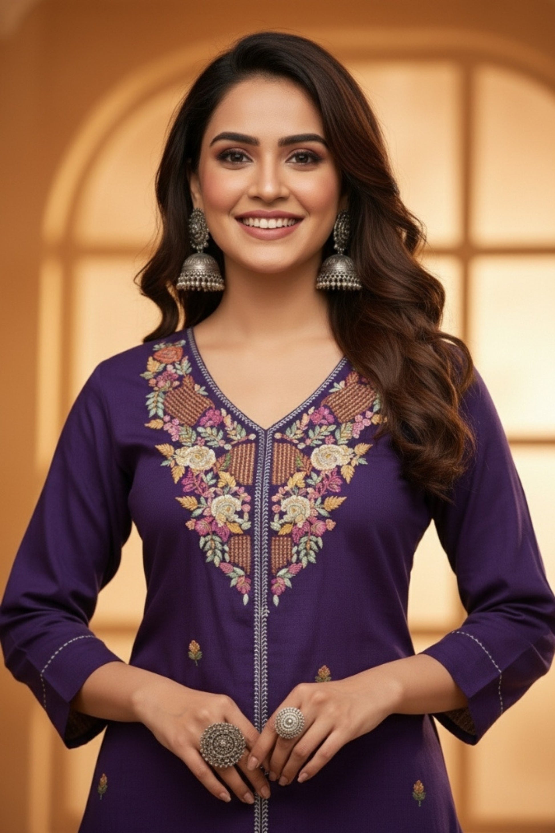 Step into elegance with our Premium Purple Suit Set with Hand Embroidery, designed to blend sophistication with everyday comfort. Crafted in breathable cotton, this set features a beautifully embroidered neckline adorned with intricate floral patterns in vibrant shades of pink, yellow, and green. The subtle scattered embroidery across the kurta adds charm, while the straight-fit pants complete the chic silhouette.