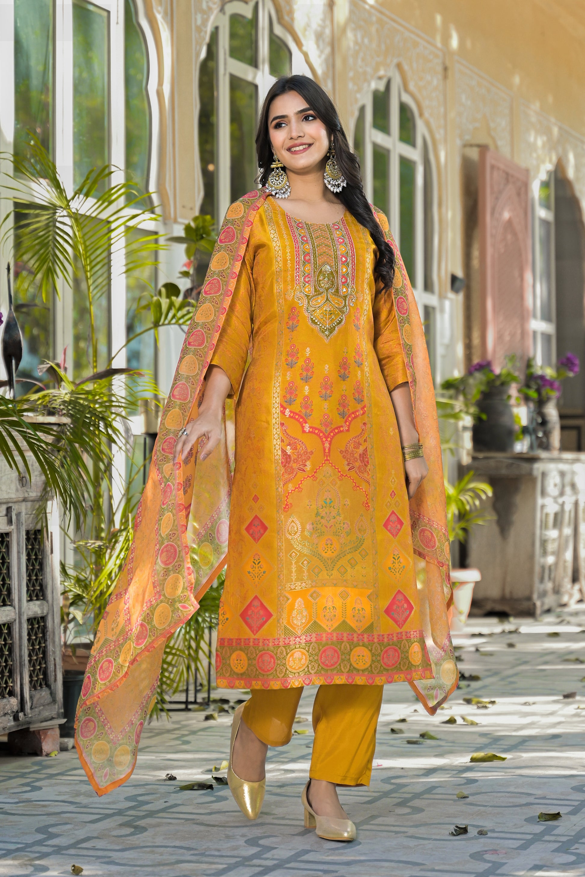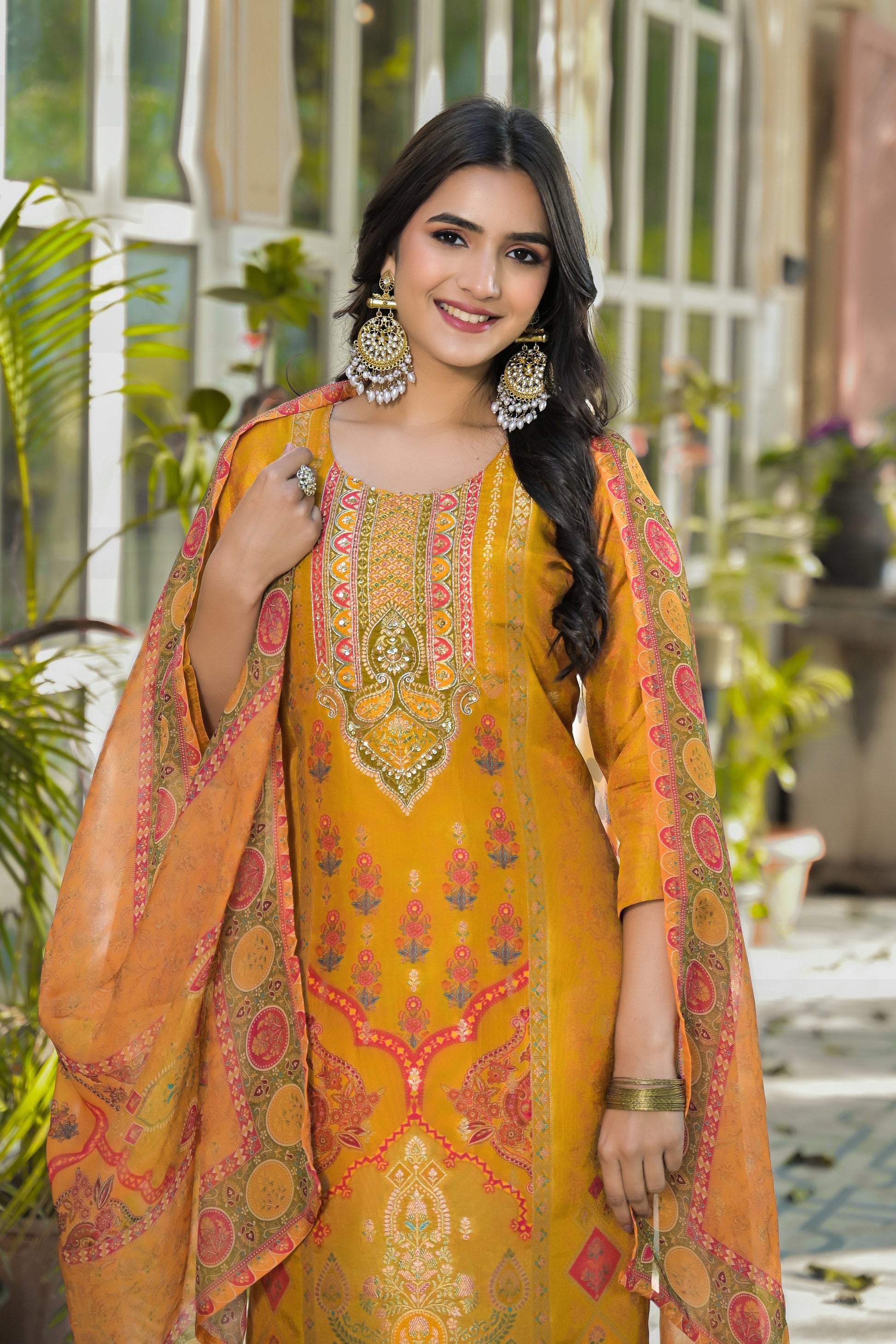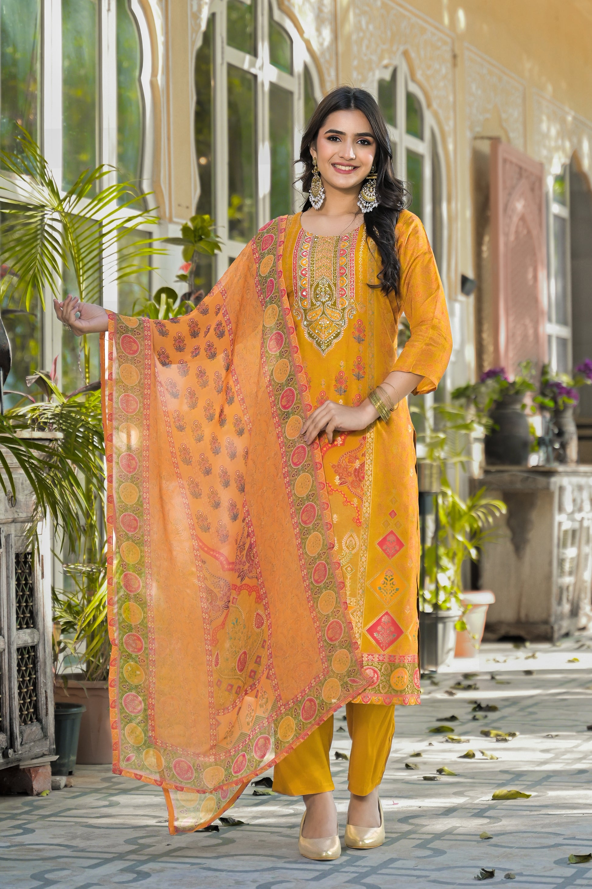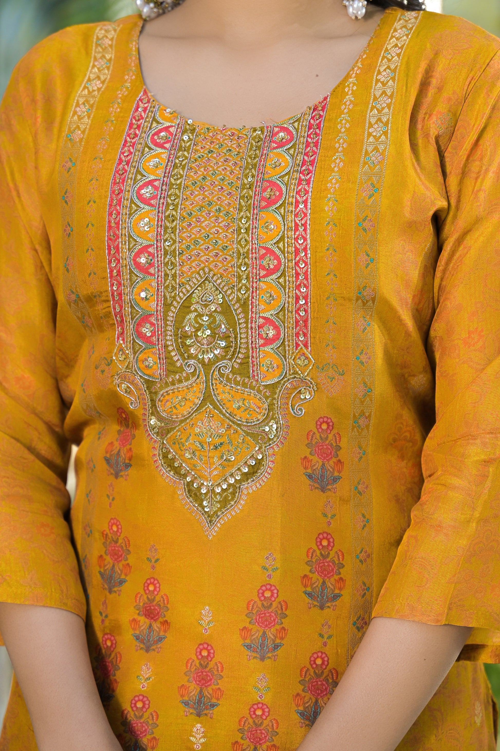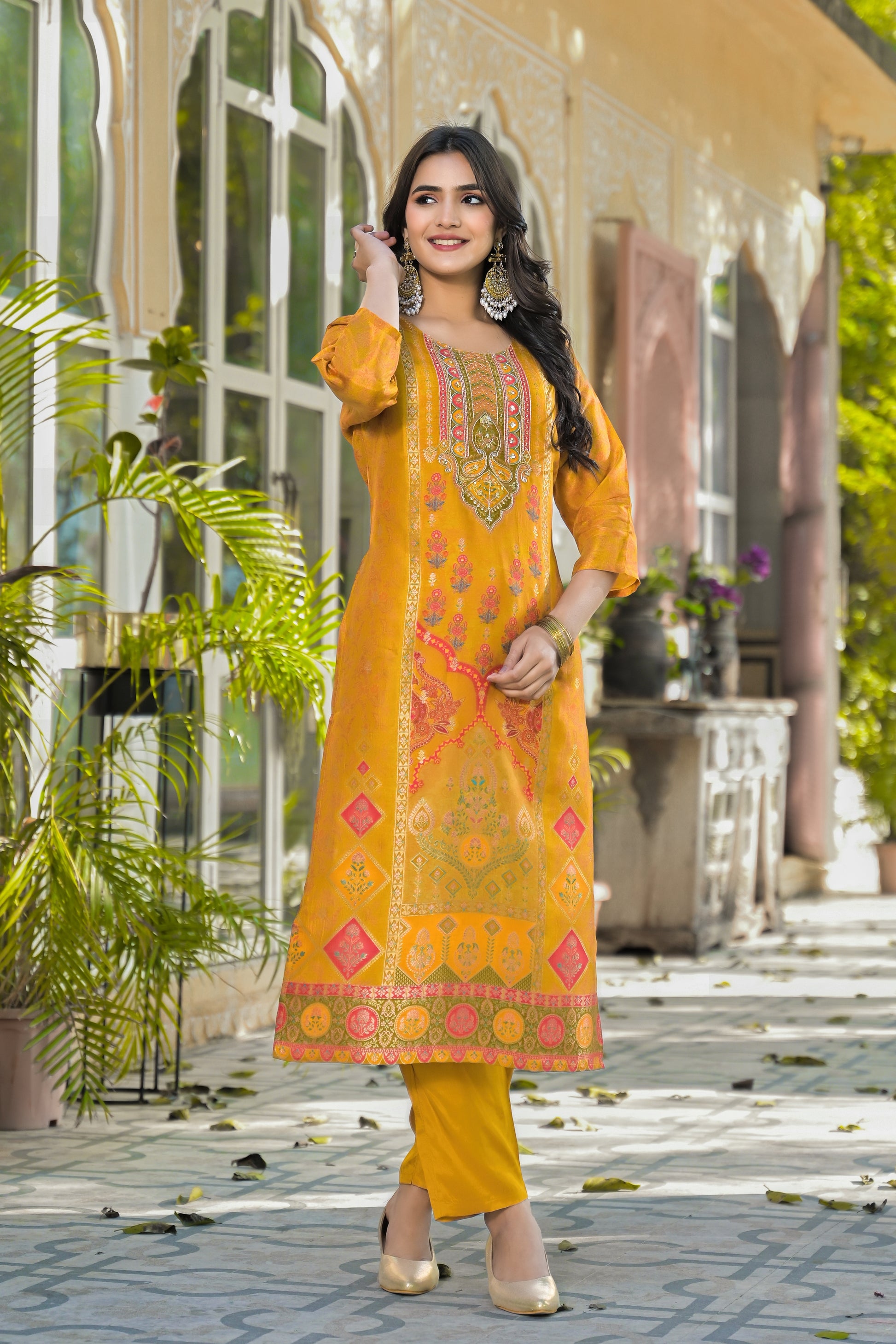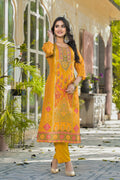 Radiate festive elegance with the Qurbat Signature Yellow Kurta Set, a timeless blend of handcrafted artistry and modern sophistication. Made from a soft silk blend, this kurta features intricate zari embroidery and mirror detailing on the neckline, complemented by delicate Bandhani-inspired prints that exude traditional charm. The vibrant mustard hue paired with a beautifully printed dupatta adds a regal touch, perfect for festive occasions, family gatherings, or cultural celebrations. Lightweight, graceful, and effortlessly stylish