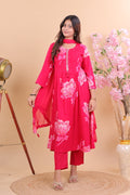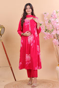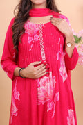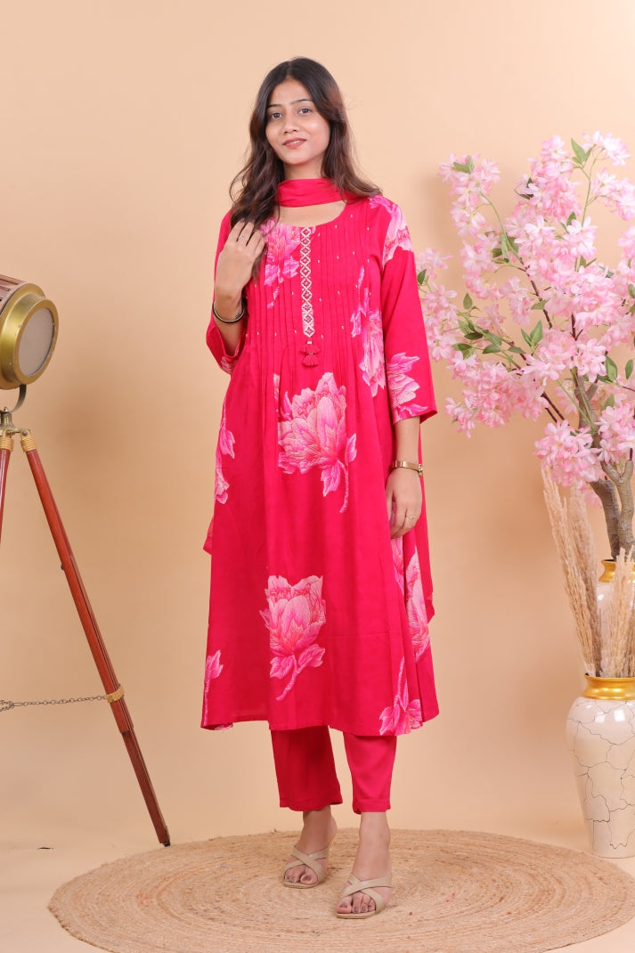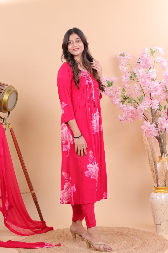 Make a bold style statement with this Vibrant Pink Rayon Floral Suit Set, designed for women who love to blend comfort with elegance. Crafted from lightweight rayon fabric, the kurta features intricate front detailing with pleats and embroidery that enhance its graceful charm. The lively pink base with large floral prints adds a refreshing pop of color, making it perfect for festive gatherings, casual outings, or office celebrations.