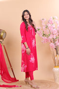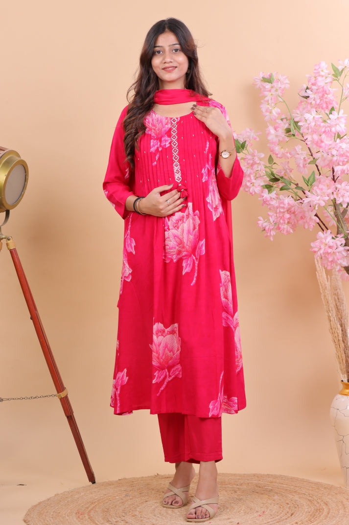 Radiant Magenta Rayon Floral Suit Set with Dupatta