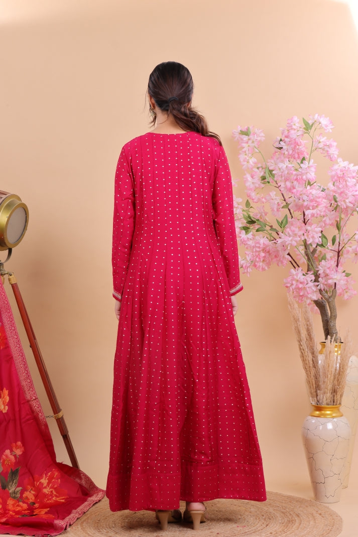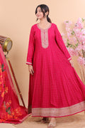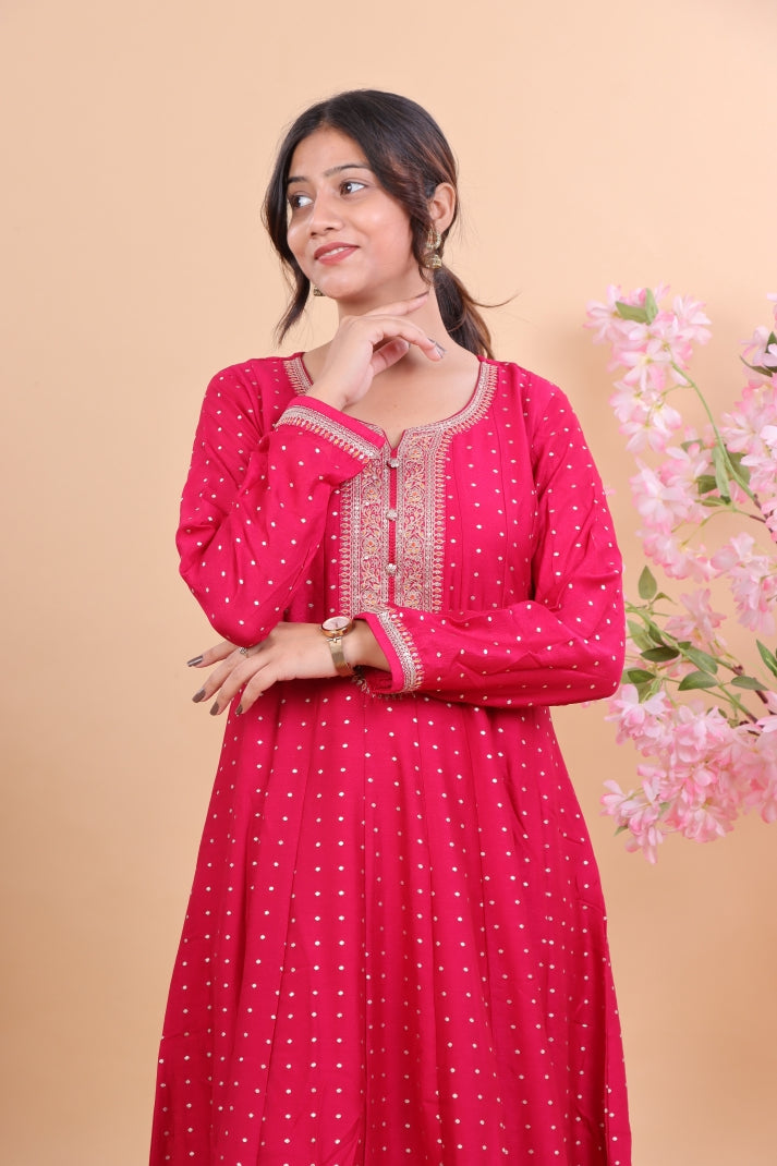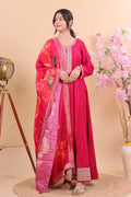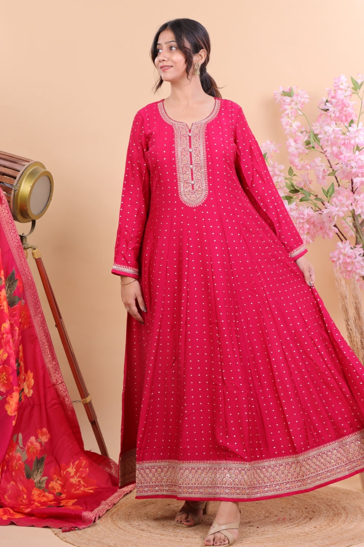 Step into timeless elegance with this Radiant Pink Silk Anarkali Suit Set, designed to make you stand out with grace and sophistication. Crafted from luxurious silk, the Anarkali features delicate embroidery on the neckline and cuffs, paired with a flowing silhouette that enhances your festive charm. The highlight of the ensemble is its vibrant floral silk dupatta, which adds a bold yet graceful touch, making it perfect for weddings, festive gatherings, or evening soirees.