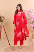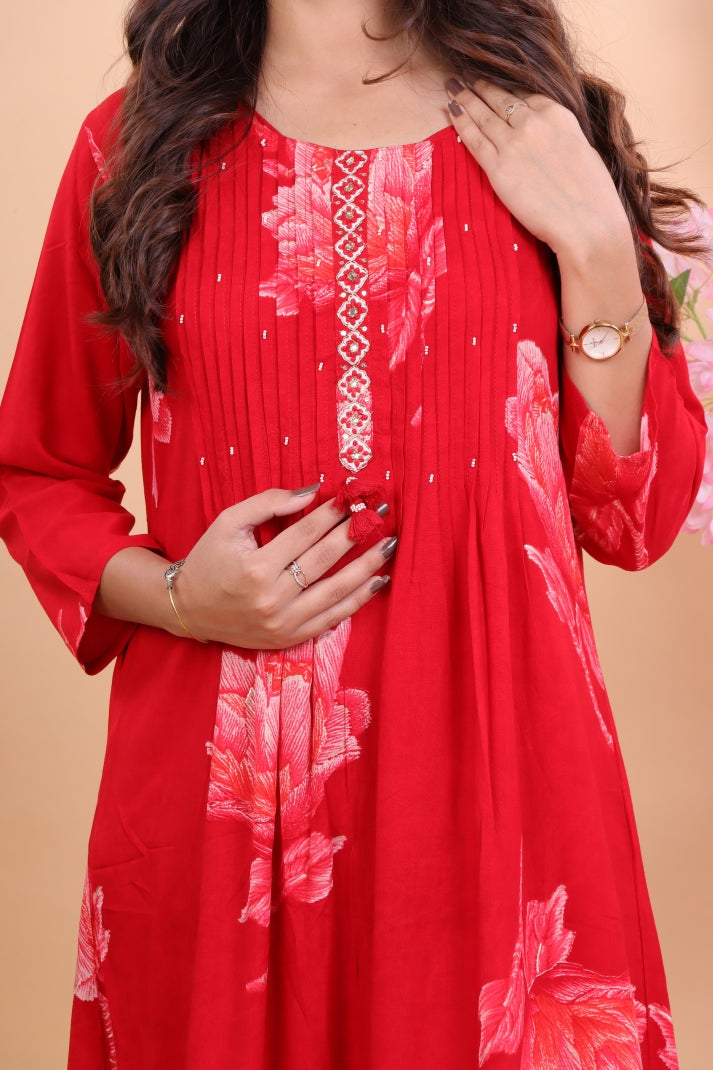 The kurta features a bright red base with striking floral prints that add vibrancy and style. Delicate embroidered detailing on the yoke and pintuck pleats enhance the silhouette, while the lightweight dupatta with tassel details completes the ensemble with a graceful flair.