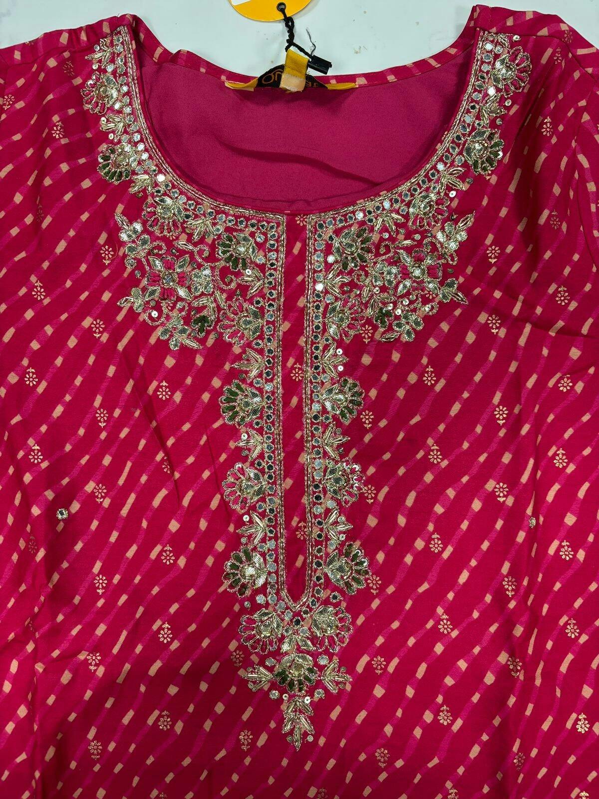 Rani Muslin Kurta Set with Intricate Neck Embroidery & Banarasi Dupatta