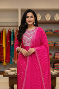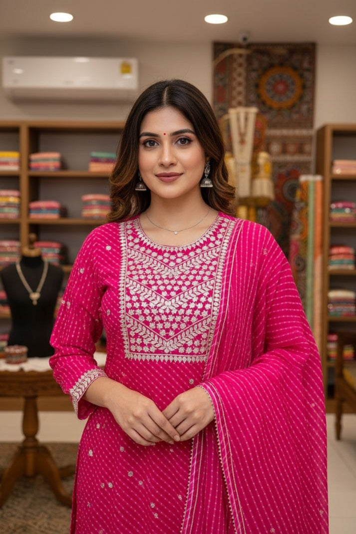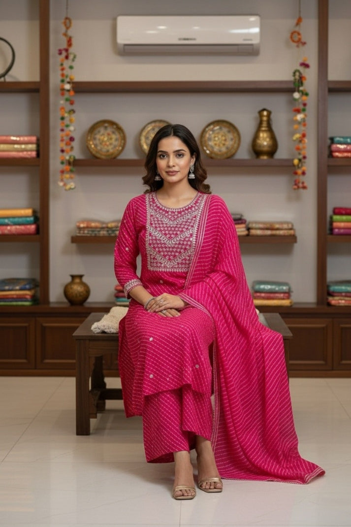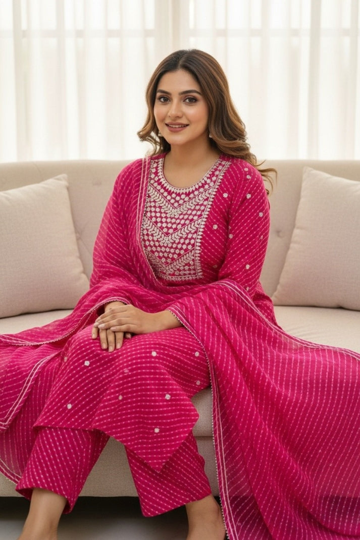 Celebrate timeless elegance with our Rani Pink Festive Striped Suit Set, adorned with intricate gota embroidery on the yoke. Crafted from breathable muslin fabric, this set features a vibrant striped pattern with delicate foil highlights that add a subtle festive shine. The kurta is paired with a matching bottom and a lightweight dupatta finished with elegant gota borders, making it perfect for festivals, family gatherings, and special occasions.
