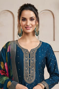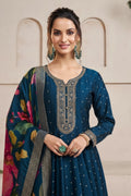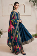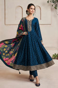 Royal Midnight Blue Anarkali Suit Set with Golden Embroidery & Floral Print Dupatta