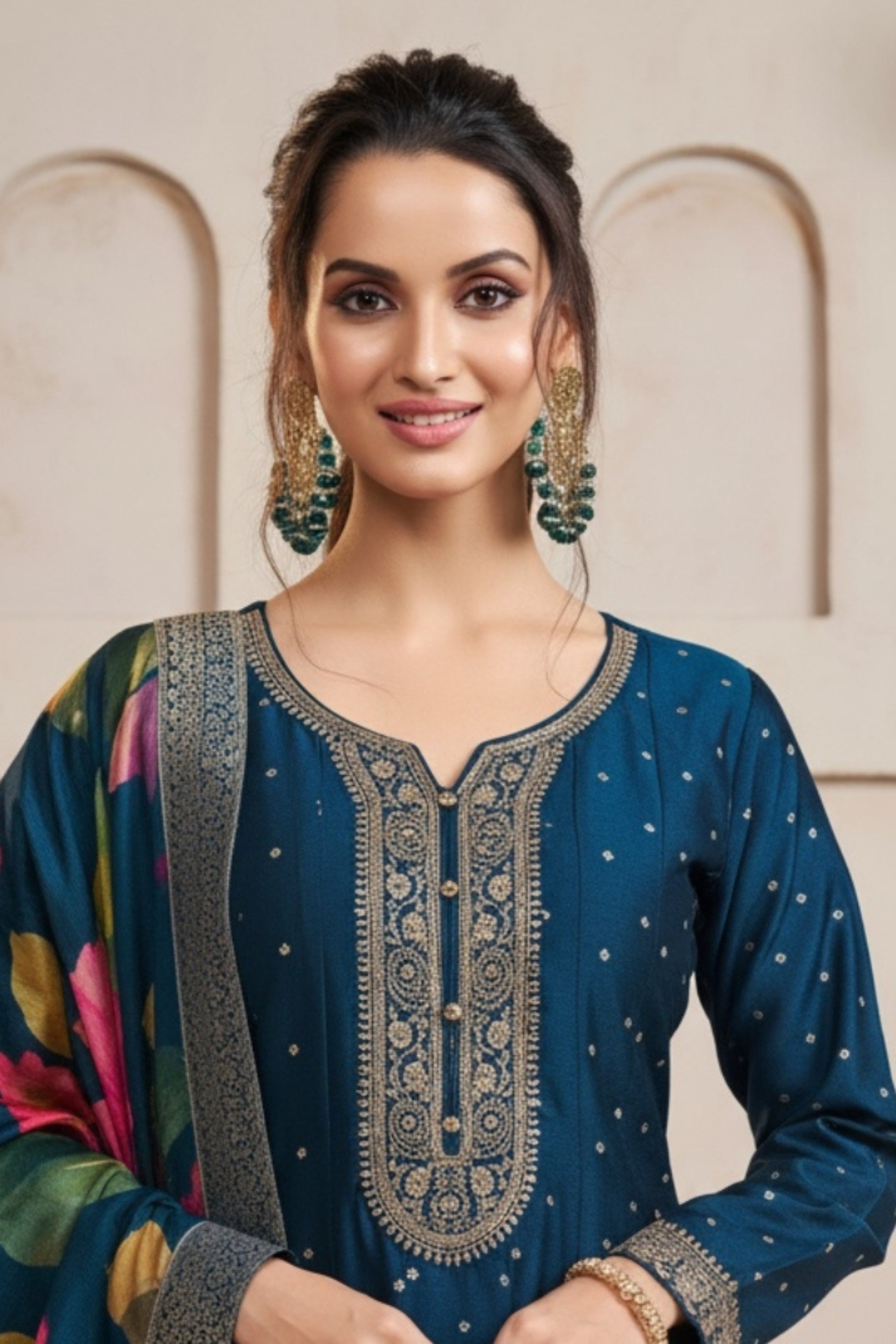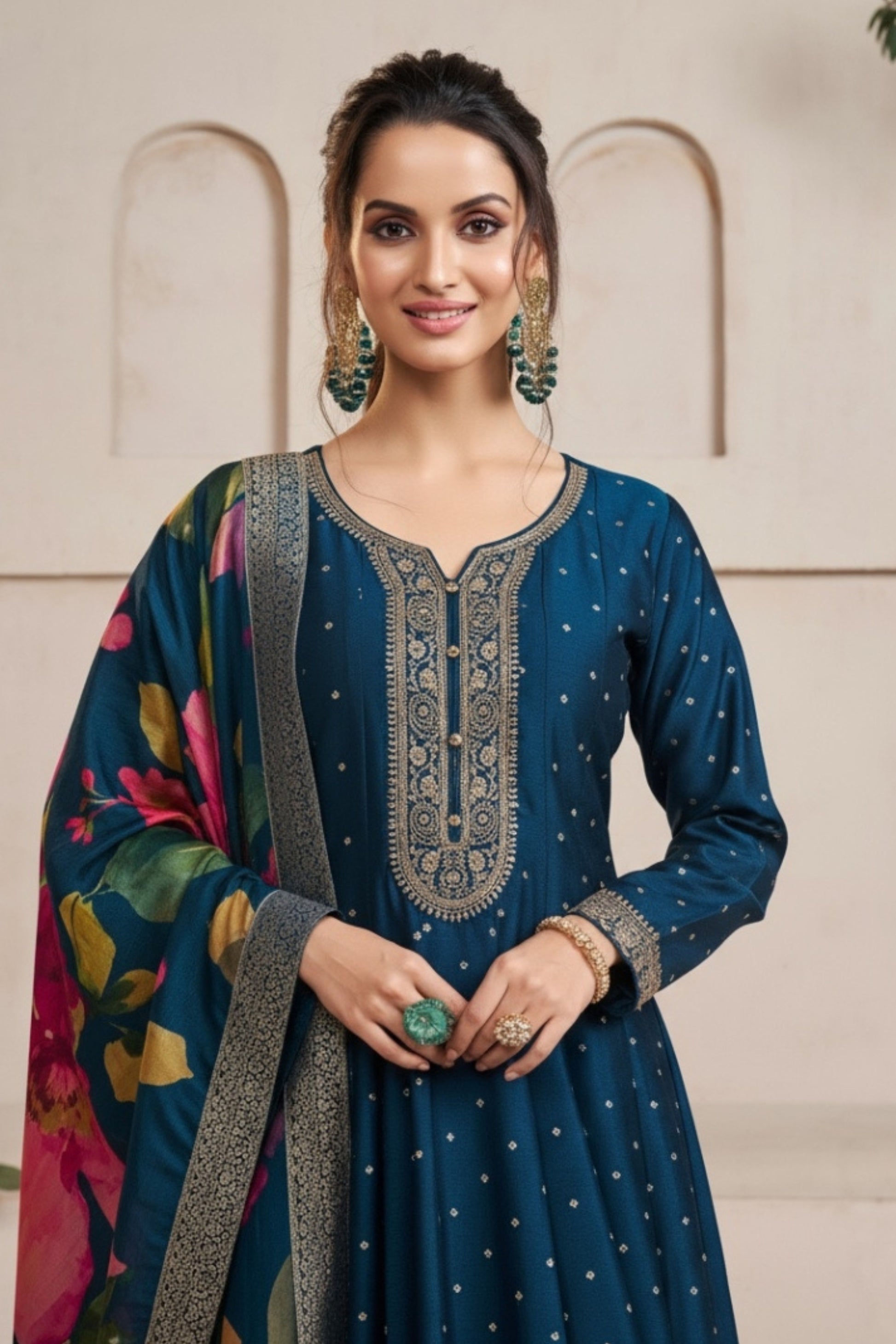 Make a statement of timeless elegance with this Royal Midnight Blue Anarkali Suit Set, crafted to reflect grace and grandeur. Designed in luxurious fabric, this ensemble features handcrafted golden zari embroidery along the neckline, sleeves, and border, adding a regal touch to the deep blue silhouette. The highlight of this outfit is its vibrant floral print dupatta, blending classic charm with a modern twist. Perfect for weddings, festive celebrations, and evening occasions, this Anarkali ensures you shine effortlessly with poise and sophistication.