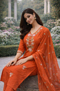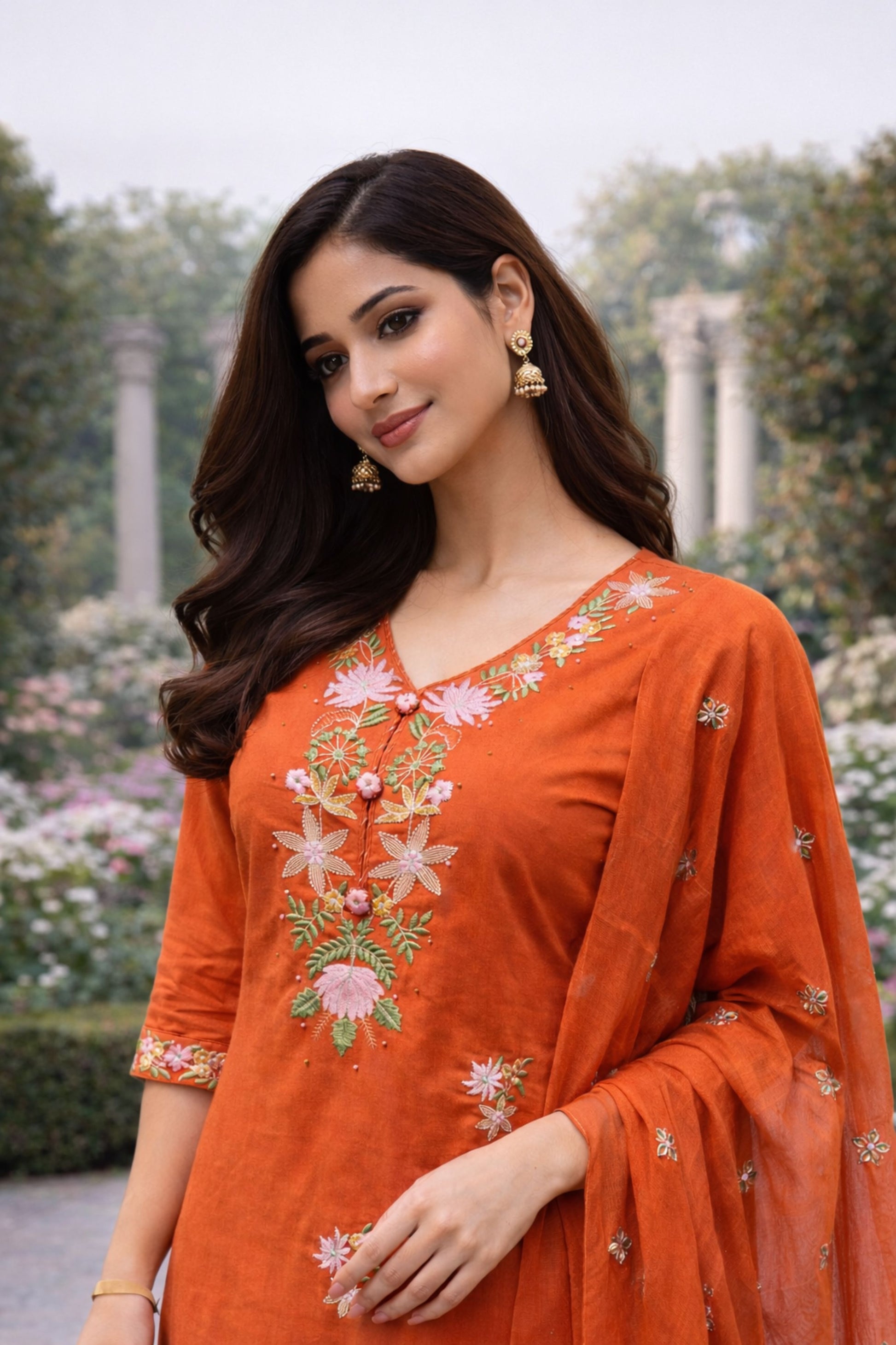 This rust floral embroidered three-piece suit set features a beautifully designed kurta paired with matching bottoms and a coordinated dupatta. The elegant print, soft color tone, and graceful silhouette create a timeless ethnic look suitable for festive occasions, family gatherings, and everyday wear. Crafted with comfortable and breathable fabric, this outfit offers effortless style along with ease of movement and all-day comfort.