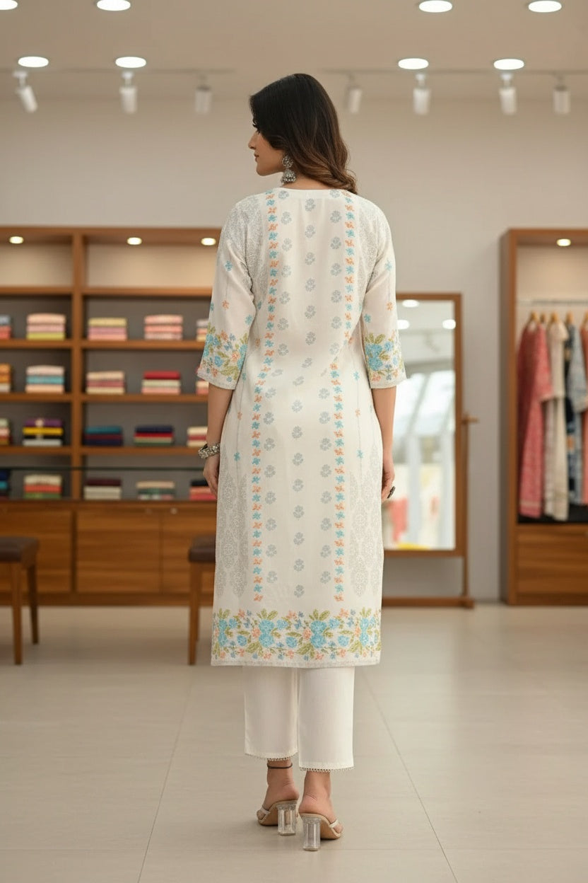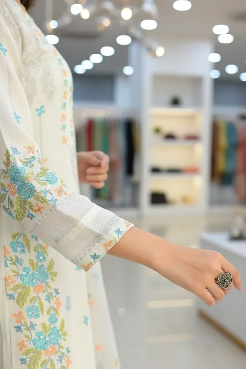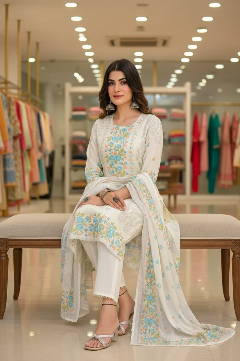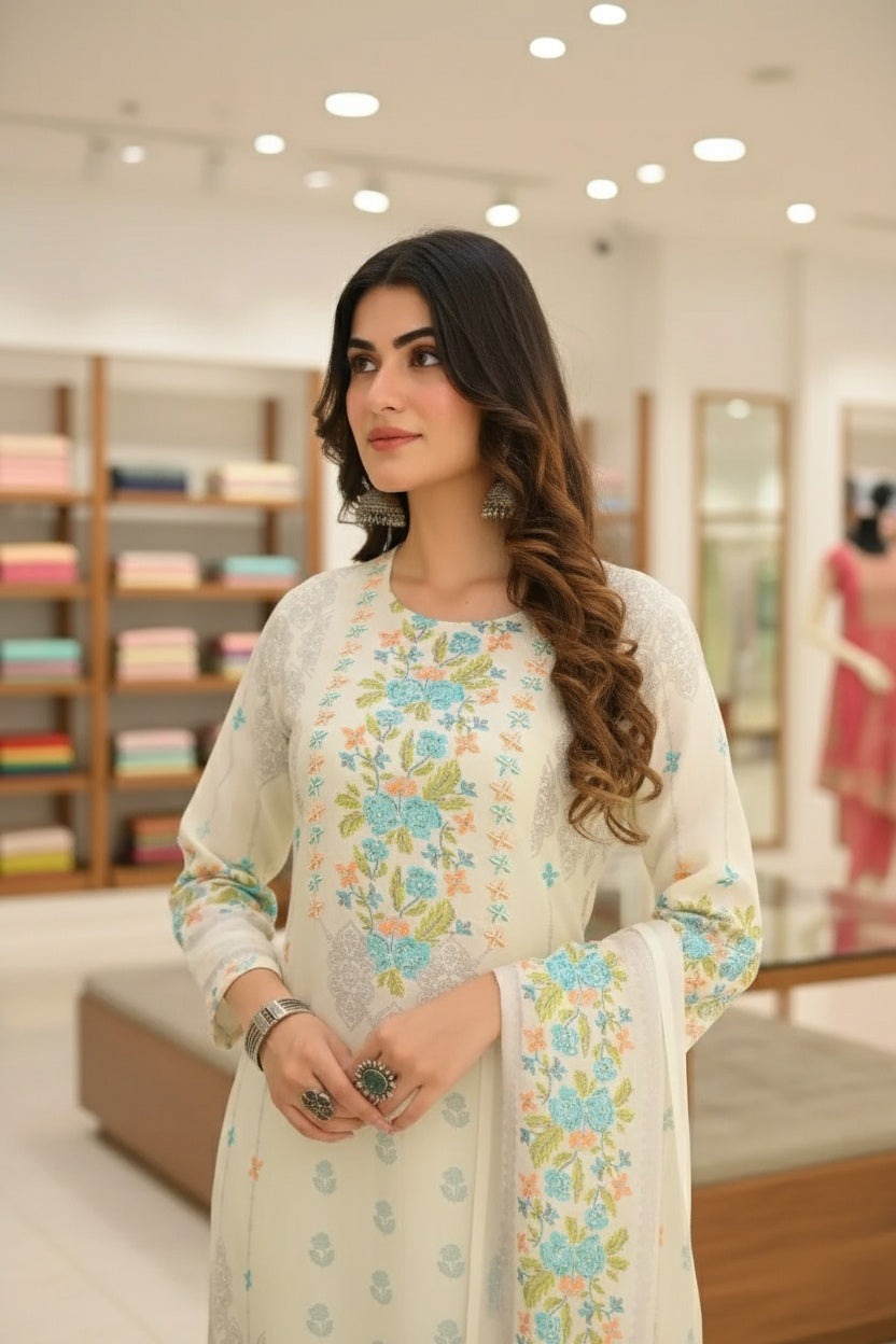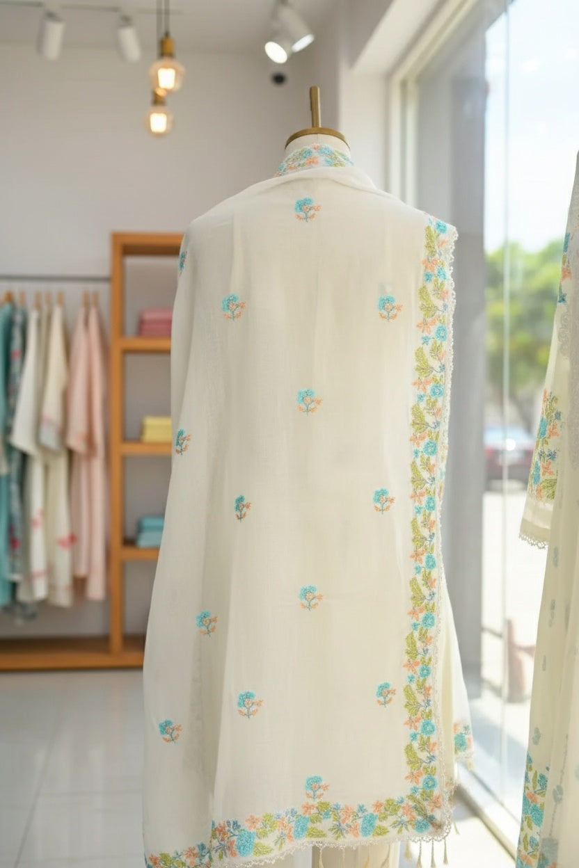 Soft Off White Floral Embroidered Three-Piece Suit Set