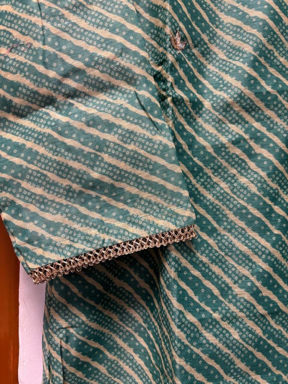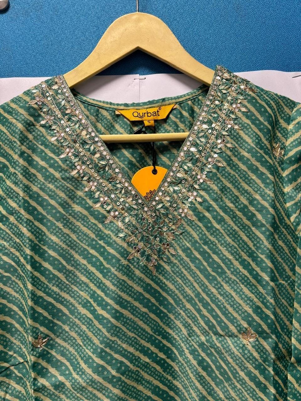 Step into effortless elegance with this stylish green striped printed kurta set, designed for both comfort and charm. The kurta features intricate embroidery around the V neckline, adding a touch of sophistication to the classic striped print. Paired with a matching bottom and a printed dupatta, this set blends tradition with modern style. Perfect for festive gatherings, casual outings, or office wear, it’s a versatile addition to your ethnic wardrobe.