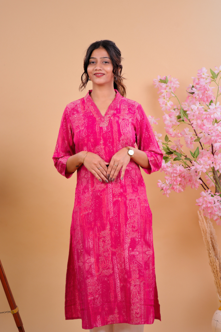 Step into effortless elegance with our Magenta Muslin Long Kurta, designed for women who love a blend of comfort and sophistication. Crafted in premium muslin fabric, this single-piece kurta feels soft and lightweight, making it perfect for all-day wear. The rich Magenta base is beautifully enhanced with delicate printed patterns, adding a festive and stylish touch to your look. Featuring a smart V-neckline with subtle detailing and comfortable 3/4th sleeves, this kurta is versatile enough to be styled for office wear, casual outings, or traditional gatherings.